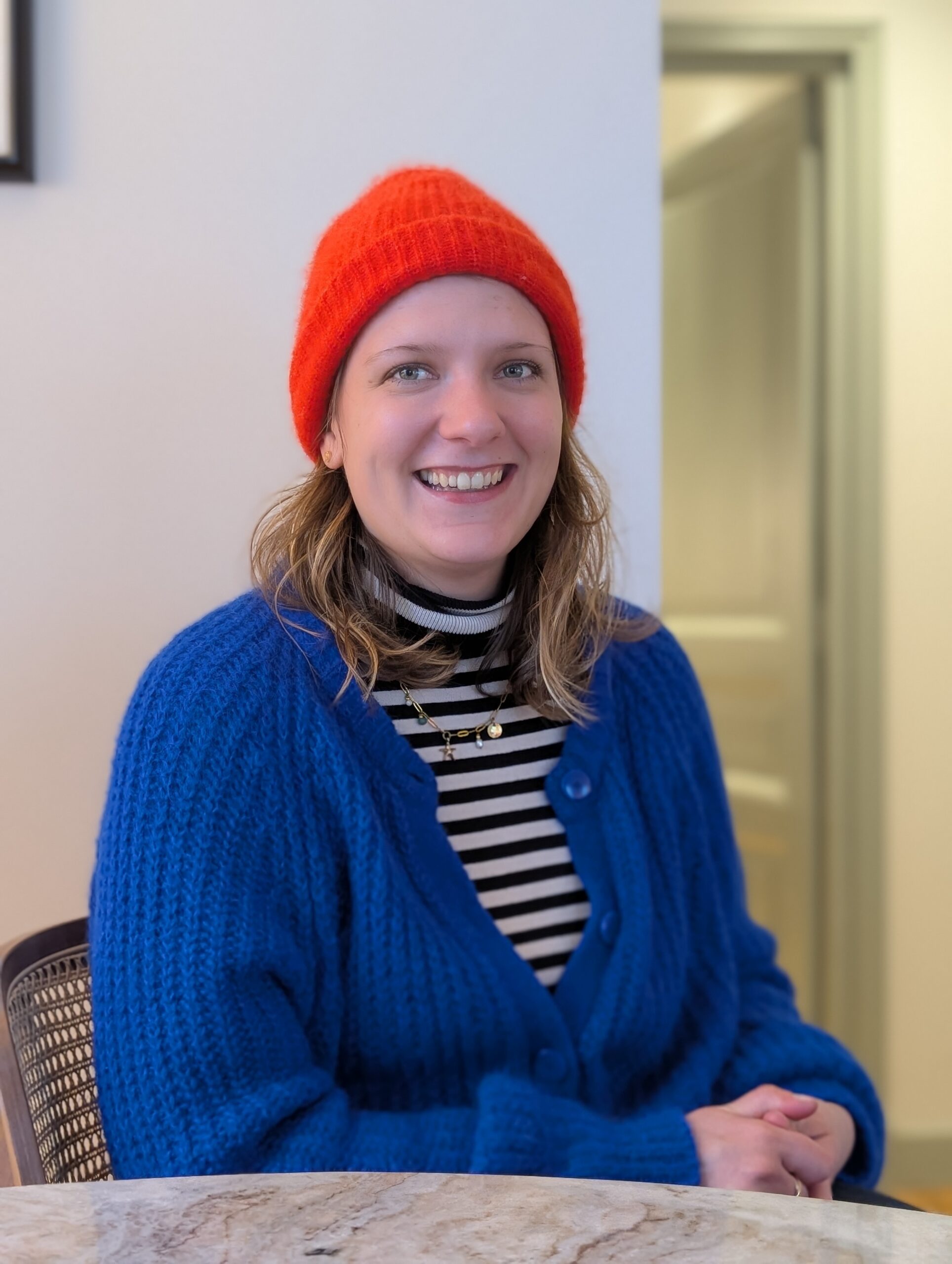 Pour braver la bruine malouine, j’avais dégainé mon pull bleu et mon plus beau bonnet rouge. Une petite armure de couleurs pour envoyer un signal clair aux résidents avant même le premier mot : même si le ciel fait grise mine, nous allons rallumer la lumière à l’intérieur.